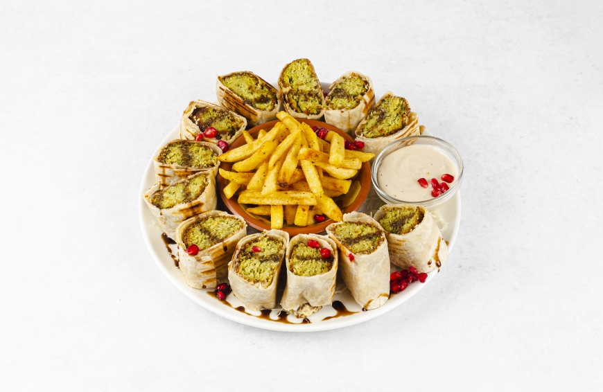 sliced and served wrap with falafel and hummus, tahini sauce, pomegranate syrup, french fries with arabic spices or arabic rice with baked noodles