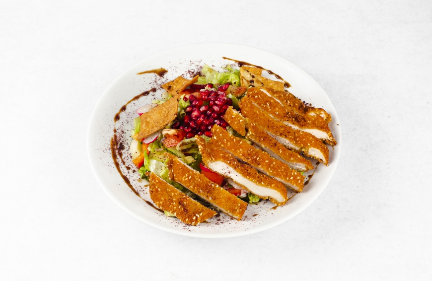 solata fattoush + orientalsko začinjeni ocvrti piščanec s sezamom